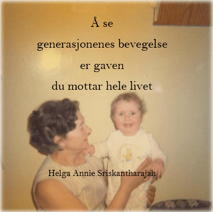Så rart å tenke på at jeg er en-og-femti, mamma er snart sytti, min sønn en-og-tredve, og mitt vakre barnebarn fyller elleve på st.hansaften. Min mormor er borte for lenge siden. Mitt barnebarn fikk aldri kjenne kjærligheten i hennes håndbak når den strøk over et sårt kinn. Min mormor får aldri oppleve den trillende latteren mitt barnebarn sender ut i verden når han er lykkelig.